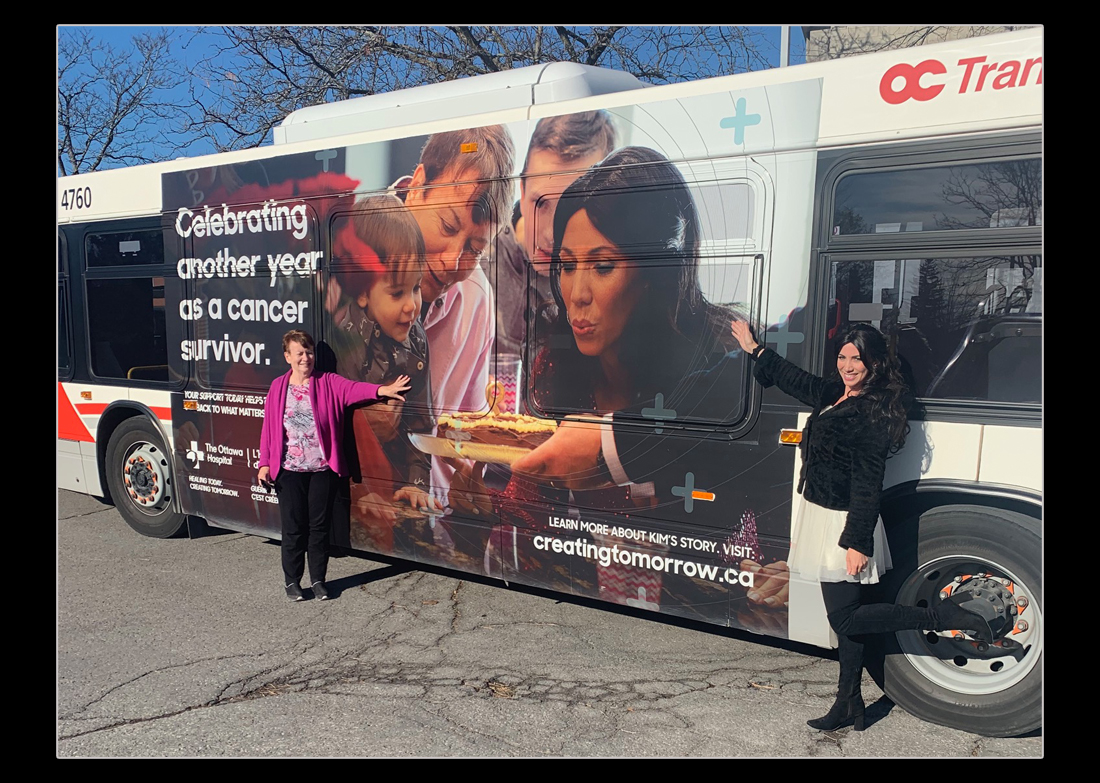 Since those first few, I’ve continued to do speeches for the Ottawa Hospital and the Canadian Cancer Society. As I write this, I’ve counted about 21 of them. Any time someone asks if I’d speak for them, I have a rule that I will absolutely never say no. They saved my life! I’m alive! Maybe this is why? So I’ve spoken at Relays for Life, to High Schools, to Charity Tournaments, fancy events, President’s Breakfasts and Dinners, and anything else they want me to. I think they ask me to because I like to keep my story positive. I also like to show everyone the reality (and fun side?) of cancer by showing up looking all normal with my long brown hair, then halfway through my speech, still doing that thing where I take my hair off and freak them out a little with my half-baldness! Haha. But then I duck under a podium, change my hair to blonde or pink and tell them how wonderful it is that I can do my hair in ten seconds! I get to make people laugh, then cry a little, and then I hope – give them hope. For anyone they might know that’s going through the same thing. I also try to get through in the speeches to remember to celebrate EVERYTHING. Every family moment. Every holiday. Every little feeling. Being a kid again and feeling the wind in your hair on a swing. The smell of the pumpkins on Halloween. The feeling of family together at Christmas. I still make sure to appreciate these things, and they still make me tear up. (I’m cheesy now, remember.) So, I do these speeches to send people the message that there is life after Cancer.. and it can be full of beautiful moments. (And also to help raise money and awareness for the great people that saved my life, and organizations that make all the research possible to save us!) This year, because of my motto of always saying yes to the hospital, I was also put on some huge pillars in the Hospital hallways, advertisements online, and even had my own BUS. That’s right… a big picture they took when my family was celebrating my 9 year Re-Birthday was put on the side of a bus. How cool is that? (I’ll include it below… cause how could I not.)